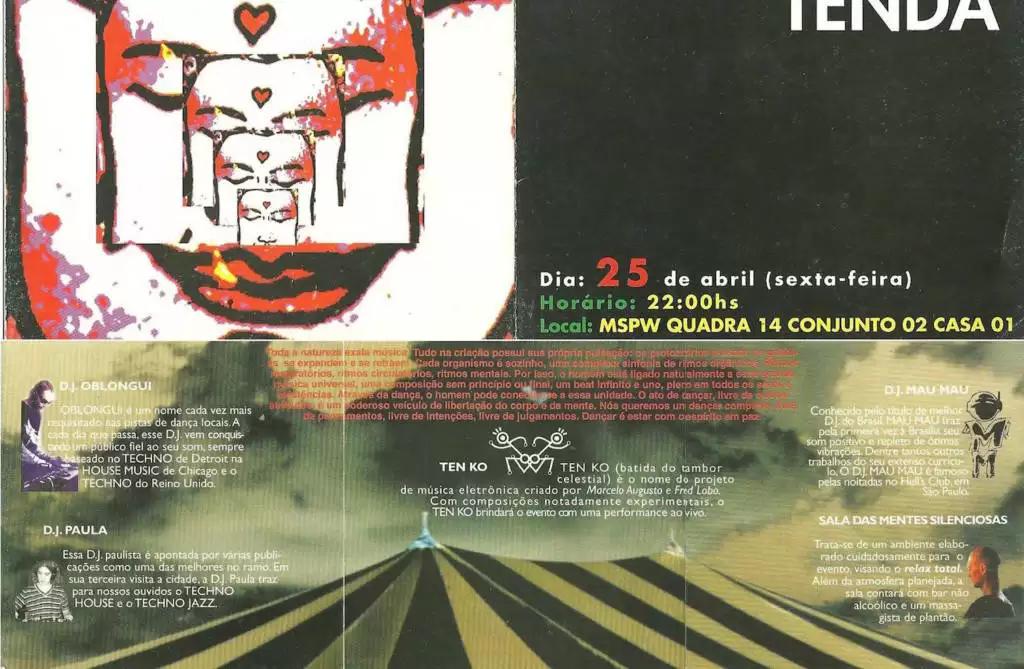 Minha primeira grande aposta foi trazer o DJ Mau Mau para Brasília — o nome mais importante do techno brasileiro na época, residente do Hell’s Club em São Paulo. Depois de meses de negociação por telefone fixo, sem agência, sem e-mail, fechamos para uma sexta-feira no Park Way, na Mansão de Vidro.