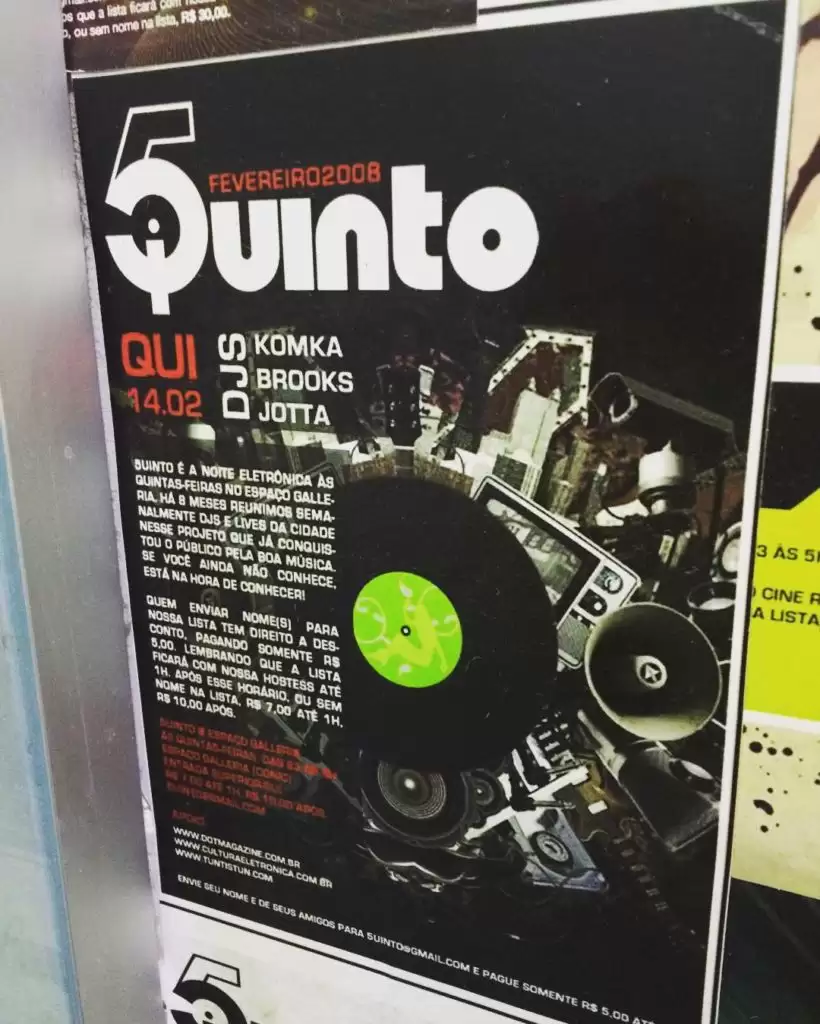 O 5uinto começou no dia 7 de junho de 2007. É um projeto idealizado pelo Ruiz Lopes e pelo Bruno Iunes e visava estabelecer uma noite fixa em Brasília às quintas-feiras. Eu conhecia o Ruiz fazia pouco tempo, e ele me falou desta idéia que coincidia com meus objetivos na época. Eu acabei entrando no projeto, ainda durante sua concepção, com o know-how de curadoria artística, pois eu já fazia muitas festas na época e conhecia vários artistas. Começamos o 5uinto então no dia 7/6, no dia do aniversário dos meus filhos, e lembro bem que a primeira noite tocamos eu, você e o Luiz Roar (Ganjão). O 5uinto perdurou no Espaço Galleria durante 10 meses e transferimos a noite para o Blackout Bar, na 904 sul. Foi mais ou menos nessa época que o Bruno Iunes deixou a sociedade e mantivemos o projeto na 904 durante praticamente uma década, com um pequeno hiato em 2009, quando o Blackout Bar fechou e passou a ser administrado pelo Thiago Carvalho, que tornou-se nosso parceiro e posteriormente nosso sócio na época em que o 5uinto tornou-se bastante popular.