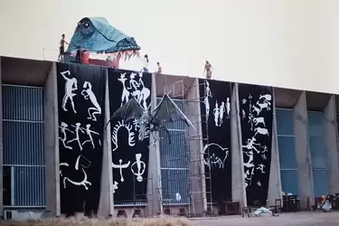 Quatro edições me marcaram muito. Por sorte consegui fotografar a decoração de algumas dessas festas. Uma, chamada Stuplash!, tinha como tema o fundo do mar. Alguns alunos, que fizeram oficina de estrutura em bambu com um dos nossos professores, criaram uns tubarões, arraias e um monstro do Lago Ness e os dependuraram nas vigas do meio do ateliê. Outros alunos criaram painéis em rolos de papel pardo com desenhos gigantes com referências marinhas. A Aninha e umas colegas, que desenhavam muito, criaram uma sereia lindona bem gigante. Todo mundo era voluntário, então ninguém se opunha ou censurava qualquer iniciativa de ajuda. Então não sei se fui entrão demais, mas rasguei um bom pedaço de papel, coloquei no chão do lado das meninas, peguei um carvão emprestado e comecei a desenhar um Namor puxando uma língua de um tubarão. Todo amigo que passava e gostava da ideia, me oferecia ajuda e entrava no barco. No fim foi uma criação conjunta com os brothers Dionísio, Bonna, Olavo e Gustavo. À noite, aquela pista principal iluminada com gelatinas azuis e verdes sobre a decoração e os painéis de vidro criaram um grande aquário bem maneiro.