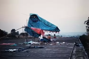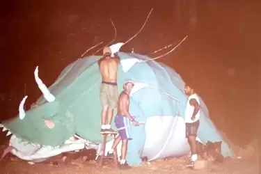 A mais notável, para mim, foi a edição dos Dinossauros. Naquele ano houve um rolo de dano ao patrimônio numa festa de outro curso dentro do ICC, então o reitor acabou com as festas dentro do prédio. Daí a organização teve que cercar uma grande área externa adjacente ao Minhocão, entre o ateliê e o teatro de arena. A galera do bambu já estava expert na técnica construtiva – foi um pouco antes deles construírem duas ocas gigantes nesse espaço -, então para criar uma ambientação jurássica o pessoal criou vários dinos espalhados pelo jardim. Teve desde um pterodátilo, dependurado entre o prédio e um poste, a uma grande cabeça de T-Rex sobre o minhocão. Mas a cereja do bolo foi momento dos brontossauros que saíam do bambuzal mais próximo à cabine do Isn´t & The Six. Eram dois pescoços compridos feitos de conjuntos de bambus amarrados e puxados com pedras por uns dias para criar uma curvatura ideal sem comprometer seus caules. Depois eles grudaram na extremidade umas cabeças articuladas, as revestiram em espuma e fecharam os detalhes em spray. Os caras eram gênios. Todo mundo que entrava na festa ficava boquiaberto. Num dado momento da madrugada um maluco inventou de se dependurar e balançar a base de um dos pescoços. Em pouco tempo outros se juntaram a ele e fizeram o mesmo com o outro pescoção. Não sei se eu já tinha passado do ponto, mas o efeito da luz estroboscópica batendo naqueles bichões sendo balançados no ritmo dos breakbeats deu pala muito real. Aquele momento foi o ponto alto da festa.