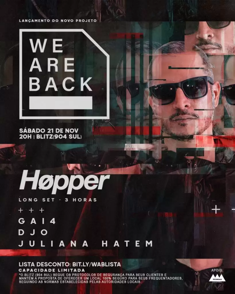 Sempre chega a hora de recomeçar! Nosso parceiro @djhopper retorna às pistas com novo projeto, #WeAreBack, onde apresenta long set de 3h. Completando o line, temos @julianahatem @gai4.dj e @jo1302. Dia 21/11, no @blitzbsb (904 Sul), com quantidade limitada de pessoas.